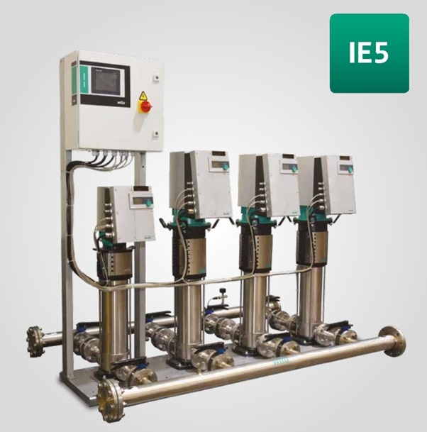 Wilo’s Hydro Pneumatic System (HNS) with IE5 motor integrates cutting-edge energy-efficient technology into water pressure boosting applications. This system combines high-efficiency IE5 EC motors with integrated, air-cooled frequency converters, ensuring optimal performance and significant energy savings. The HNS is designed for large buildings and industrial applications, providing reliable water supply even under fluctuating demand conditions. Its features include pressure-variable control modes, dry-running detection, and seamless integration into building automation systems via standard communication protocols like Modbus TCP and BACnet IP .
